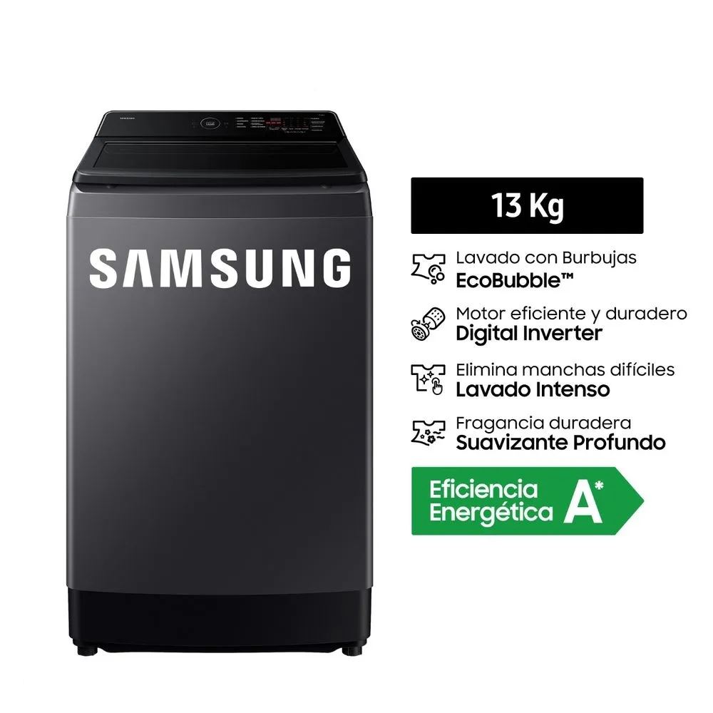 Ideal para grandes cargas como edredones o toallas. Con tecnología EcoBubble™ que ahorra hasta 60% de energía y 14% de agua, BubbleStorm™ para penetración rápida del detergente y Dual Storm™ que genera un vórtice de agua para mejor lavado. Incorpora Motor Digital Inverter silencioso y duradero con 20 años de garantía, clase energética A. Cuenta con 8 ciclos de lavado, panel digital con inicio diferido, bloqueo para niños y control de sonido. Tambor de acero inoxidable Diamond Drum que cuida las telas delicadas. Velocidad de centrifugado aprox. 700 RPM. Funciones extra: limpieza ecológica del tambor, suavizante potente y bloqueo de seguridad.